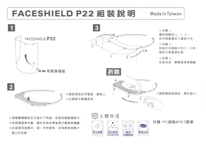 品質優良:PC鏡框&PET面罩製造的立體防護面罩,1. 可隔離,防止噴濺、防水、防飛沫、防油煙